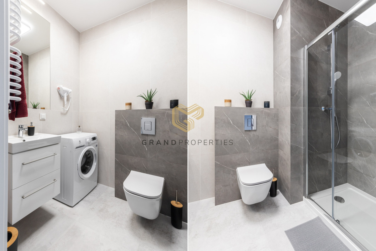 Elegancka i funkcjonalna: prysznic, toaleta, umywalka, lustro, pralka automatyczna.