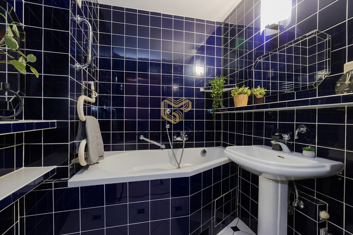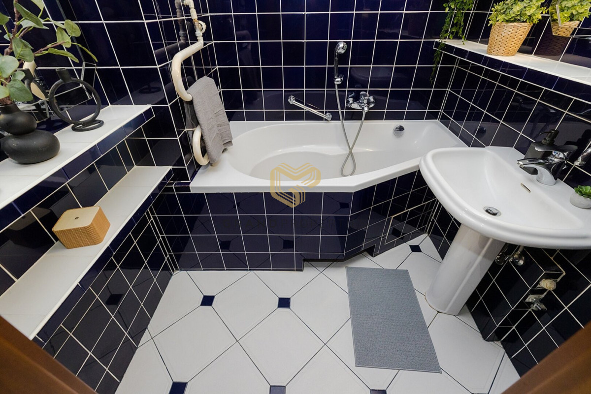 Łazienka z prysznicem i wanną, toaleta, umywalka, lustro, pralka.